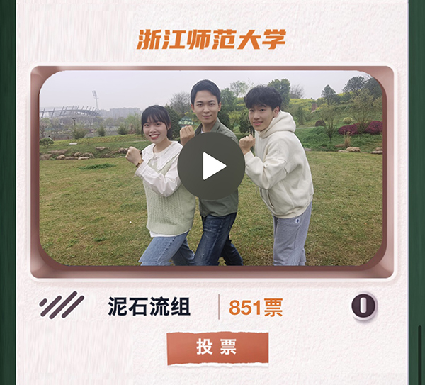 目前,体验官团队已进入终极pk环节,“泥石流”组代表浙江师范大学与其他三所高校在线battle,争夺浙江卫视“中国共产党为什么能”常驻体验官团队席位。快来给他们投票吧!投票时间截止到4月1日12:00前。