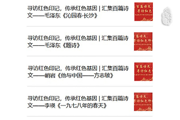 一篇篇慷慨激昂的诗文、一个个动人的故事、一段段精彩的解读……《沁园春·长沙》《邓小平之歌(节选)》《我爱这土地》等百篇红色经典诗文,经人文学子搜集整理、精心解读,为党的百年华诞献礼。