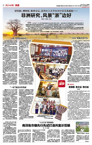 9月7日,《浙江日报》第6版整版刊文《研究院、博物馆、智库论坛,浙师大三大平台为中非关系赋能——非洲研究,风景“浙”边好》,报道了非洲研究院、非洲博物馆、中非智库论坛作为体系建构的三大实践“主平台”在推动中非合作、为中非关系赋能所做出的贡献。