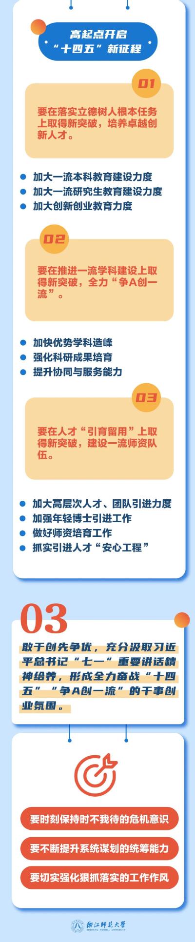 ——要高起点开启“十四五”新征程。在落实立德树人根本任务上取得新突破,加大一流本科教育、一流研究生教育建设力度,加大创新创业教育力度,培养卓越创新人才;在推进一流学科建设上取得新突破,加快优势学科造峰,强化科研成果培育,提升协同与服务能力,全力“争a创一流”;在人才“引育留用”上取得新突破,加大高层次人才、团队引进力度,加强年轻博士引进工作,做好师资培育工作,抓实引进人才“安心工程”,建设一流师资队伍。
