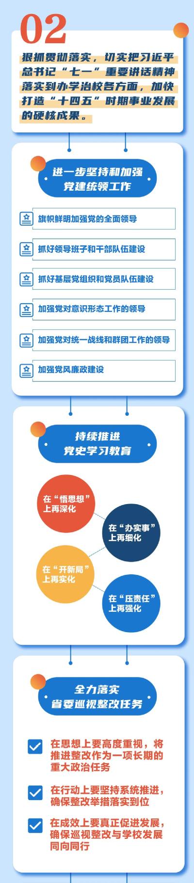 ——要全力落实省委巡视整改任务。在思想上高度重视,将推进整改作为一项长期的重大政治任务;在行动上坚持系统推进,确保整改举措落实到位;在成效上真正促进发展,确保巡视整改与学校发展同向同行。