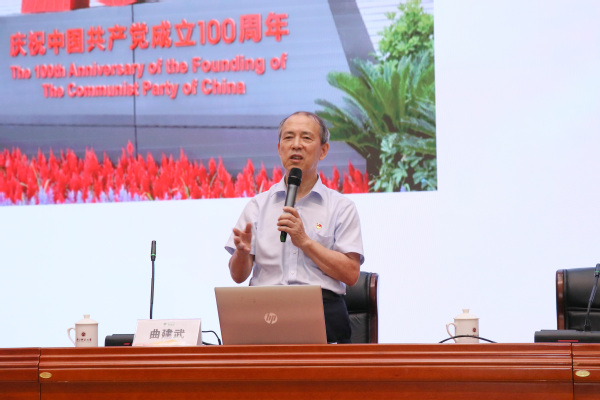 曲建武教授重点解读了习近平总书记“七一”重要讲话精神,分享了受邀参加庆祝中国共产党成立100周年大会的切身感受,并阐述了自己对育人工作的理解和挚爱。结合自己思想政治工作的丰富经历和对教师职业梦想的坚守,曲建武教授从文化视角、政治视角、办人民满意的高等教育视角三个方面,深刻阐释了高校辅导员的初心与使命,围绕坚定理想信念、把爱国爱党教育放在首位、关心学生生活、做好网络思想政治教育等12个方面解读了高校辅导员铸魂育人工作的实务要点。