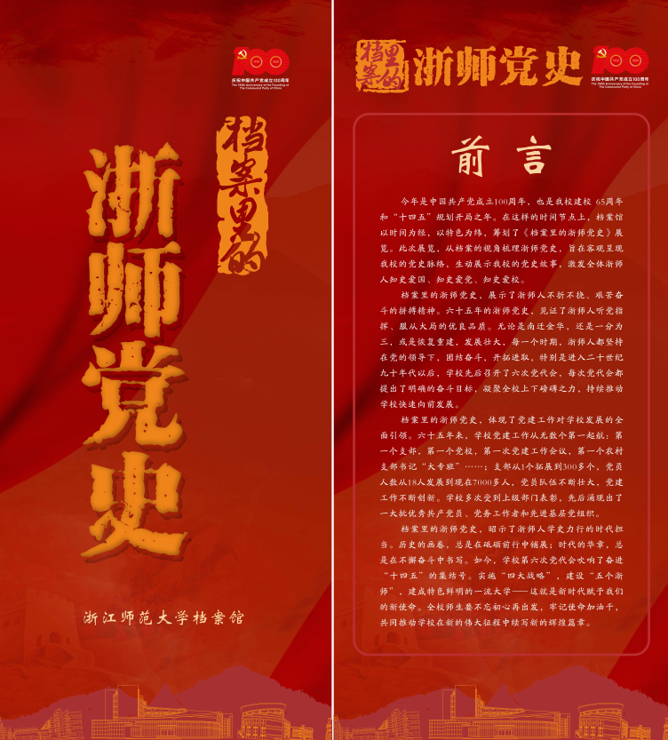 今年是中国共产党成立100周年,也是浙师大建校65周年和“十四五”规划开局之年,学校师生正在认真开展党史学习教育。在此背景下,学校档案馆专门筹划了《档案里的浙师党史》展览,以时间为经,以特色为纬,从档案的视角对浙师党史进行梳理,旨在客观呈现浙师大的党史脉络,生动展示浙师大的党史故事,激发全体浙师人知史爱国、知史爱党、知史爱校。