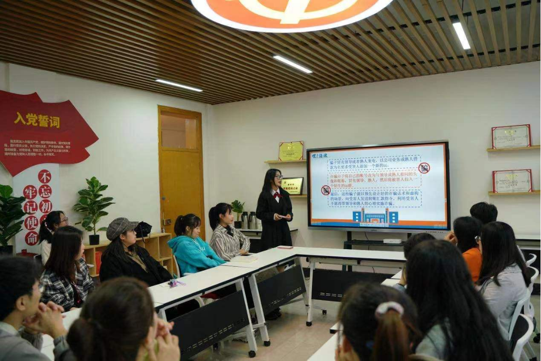 为筑牢校园安全的“铜墙铁壁”,学校联合金华市婺城区联席办组建起专业化反诈宣教队伍组——“心盟”宣讲团,将反诈知识带到每一个班级、每一间寝室,以及每一位同学身边。