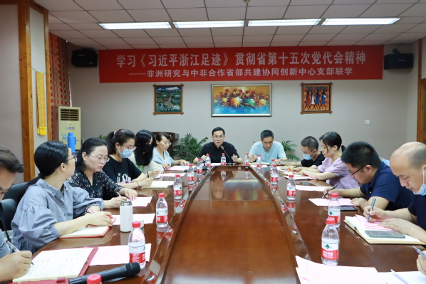 6月24日,浙江师范大学非洲研究与中非合作省部共建协同创新中心举行“省第十五次党代会精神和《干在实处 勇立潮头——习近平浙江足迹》”支部联学,此次主题党日活动由非洲研究院党总支牵头组织,协同中心各成员单位党组织党员代表参加。联学会上,浙江省第十五次党代会代表、浙师大文化创意与传播学院院长施俊天教授传达了省第十五次党代会精神。与会人员表示,要以构建中非命运共同体为目标指引,依托学科、智库和平台优势,扎实做好战略研究、咨政建言、人才培养、舆论引导、公共外交、国际传播,在推进中非、浙非合作,在服务国家战略和地方发展中体现师生党员的先锋模范作用,为打造展示社会主义制度优越性的重要窗口提供有力的智力支持和人才支撑,以优异的成绩迎接党的二十大胜利召开。