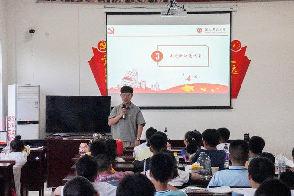 守好红色根脉、助力乡村振兴。浙江师范大学“情暖童心 为爱陪伴”暑期社会实践队创新形式开展红色宣讲,精心设计了红色班会,带来了一场深入浅出的思想交流。队员们带领孩子们从“什么是党代会”“讲了什么内容”“我们要怎么做”等三个方面步步深入,解读省党代会精神,于潜移默化间培育孩子们的爱党爱国意识,提高思想觉悟。