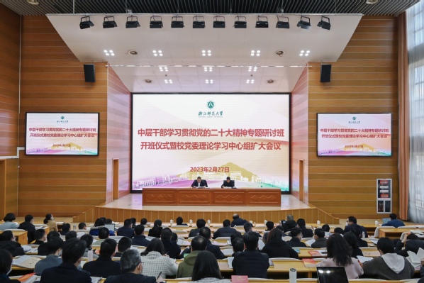 2月27日,中层干部学习贯彻党的二十大精神专题研讨班开班仪式在行政中心报告厅举行,浙师大党委书记郑孟状作开班动员讲话并作辅导报告,校长蒋云良主持会议。