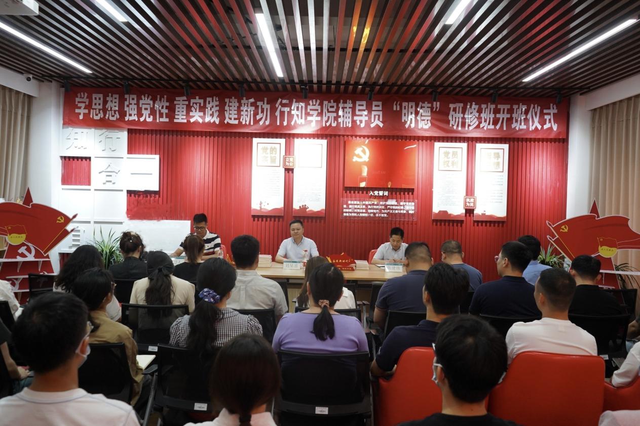 6月6日,为全面贯彻习近平新时代中国特色社会主义思想和党的二十大精神,应对大学生思想政治教育工作中提出的新观点、新要求,统一思想,明确任务,提升辅导员业务能力和水平,建设一支政治够硬、业务够强、能力够高的高素质学工队伍,行知学院在党群服务中心举行思政辅导员党徽佩戴仪式暨辅导员“明德”研修班开班仪式。