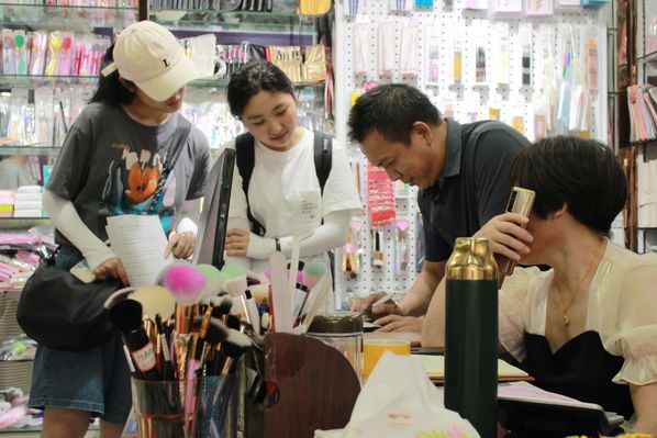 在采访过程中,队员们遇到了一位来义乌创业十多年的文具店老板,他始终顺应国际化潮流的发展,坚持“品质至上”的原则。从他的热情介绍中,队员们感受到了商贸城小商户创业初期的艰辛与这十几年间的“变”与“新”。