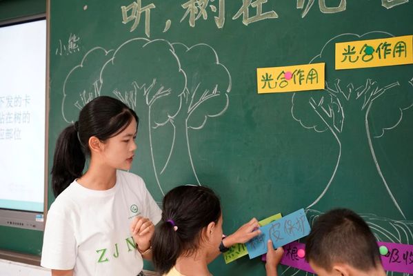 乡土性是乡村教育的底色。实践队员走进开化县天地小学,发挥专业特长开设环境科普和地理科普两大主题课程并编制特色教材,开展红色情景剧、瑜伽足球、书法绘画、农事科普等夏令营活动,构建“德智体美劳”五育融通式课程体系。实践队员联合浙江师范大学天文协会,立足乡村优质星空资源,设计别具一格的星空观测课堂,点亮孩子的星空奇梦,叩开他们学习天文、热爱科学的大门。