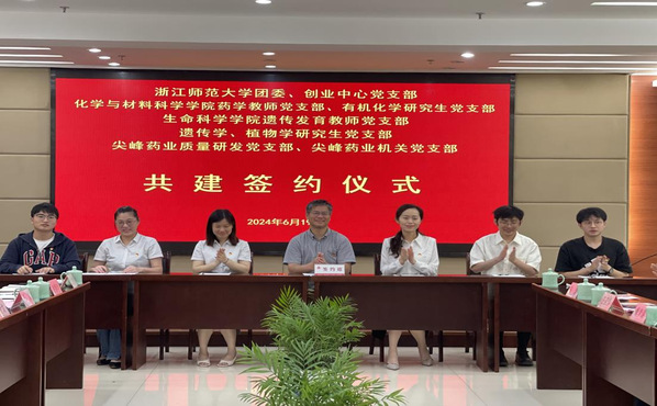浙师大团委、创业中心党支部,化学与材料科学学院药学教师党支部、有机化学研究生党支部,生命科学学院遗传发育教师党支部、全国百个研究生样板党支部遗传学、植物学硕士研究生党支部,与尖峰药业质量研发党支部、机关党支部结成党建共同体,双方现场签署了共建协议书。