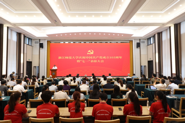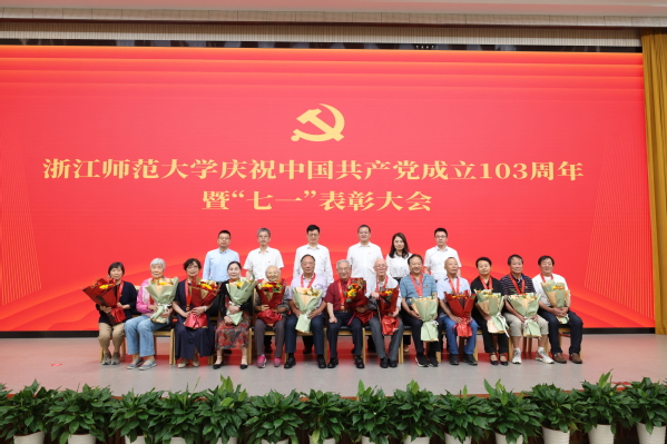 6月28日上午,浙江师范大学庆祝中国共产党成立103周年暨“七一”表彰大会在正阳楼2号楼会议室举行。在校校领导、党委委员,党群部门负责人、各二级党组织书记出席会议。“光荣在党50年”纪念章获得者、受表彰的先进集体和个人,教师、学生党员代表参加会议。