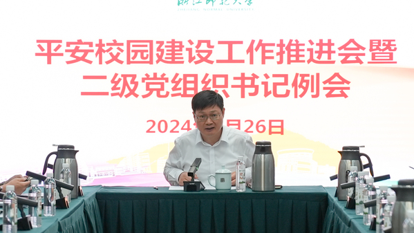 9月26日,浙江师范大学平安校园建设工作推进会暨二级党组织书记例会在行政楼多功能会议室召开。浙师大党委书记蒋云良主持会议并讲话,党委副书记傅关福,省监察专员、校党委委员、纪委书记吕文革,党委委员、组织部、统战部部长王淑娉,党委委员、宣传部、教师工作部部长葛永海出席会议。