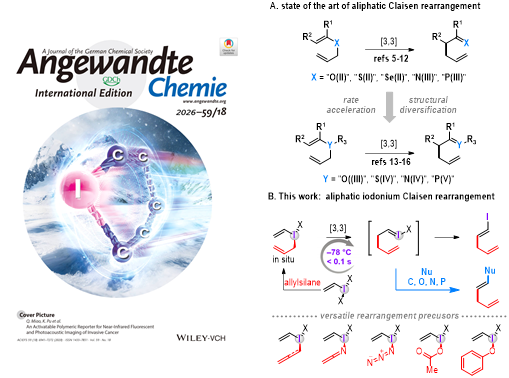 近日,化材学院彭勃/黄鑫团队在重排化学领域取得突破性进展。相关成果“millisecond aliphatic iodonium‐claisen rearrangement enabling dual functionalization of alkenyl iodanes”作为封面文章和 hot paper在国际权威综合性化学期刊 angewandte chemie 上发表(angew. chem. int. ed. 2026, e202526108.)。