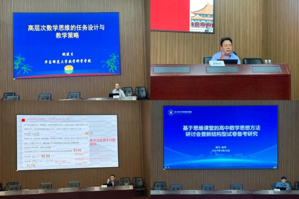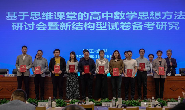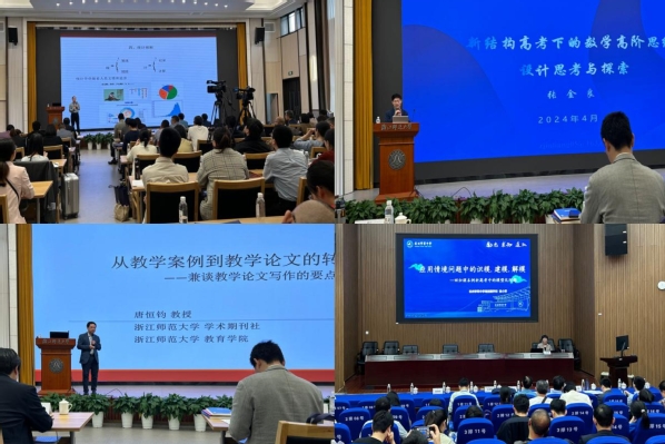 4月26日,基于思维课堂的高中数学思想方法研讨会暨新结构型试卷备考研究会议在浙江师范大学举行。原浙江省高中数学教研员、正高、特级教师张金良,浙江师范大学数学科学学院党委书记张勇出席会议并致辞,出席会议还有浙江省教育厅教研室现任高中数学教研员江战明、浙江大学出版社总编特别助理葛玉丹、浙江师范大学《中学教研(数学)》主编唐恒钧教授等专家与嘉宾,来自省内各中学的百余名一线教师和教研员参加了现场会议。来自全国各地的七千四百多教师,在线观摩了会议。会议分别由杭州长河高级中学党委书记杨帆、温州教育局团委副书记李雪纯主持。