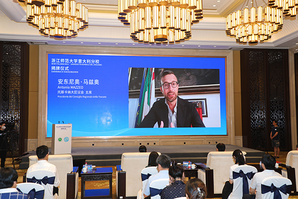 6月28日,浙江师范大学首个海外分校——浙江师范大学意大利分校揭牌仪式在杭州花家山庄、意大利托斯卡纳大区同时举行。浙江省人民政府外事办公室主任顾建新、浙江省教育厅副厅长汤筱疏、浙江师范大学校长郑孟状共同为校区成立揭牌。中国驻佛罗伦萨总领事王文刚、意大利托斯卡纳大区议会主席安东尼奥·马兹奥、意大利教育部托斯卡纳大区学校办公室主任埃尔内斯托·贝蕾齐亚、佛罗伦萨市第五区区长克里斯蒂亚诺·巴利、意大利驻上海总领馆文化处处长弗朗西斯科·达仁利等出席揭牌仪式。仪式由浙师大副校长钟依均主持。