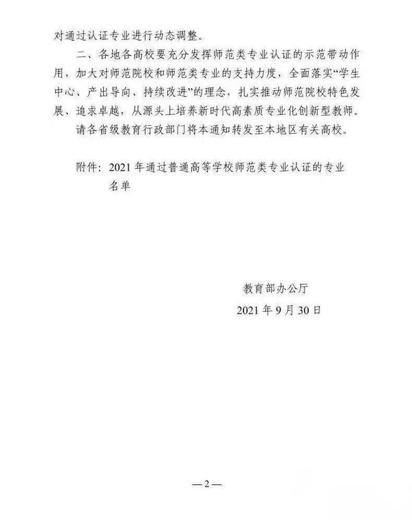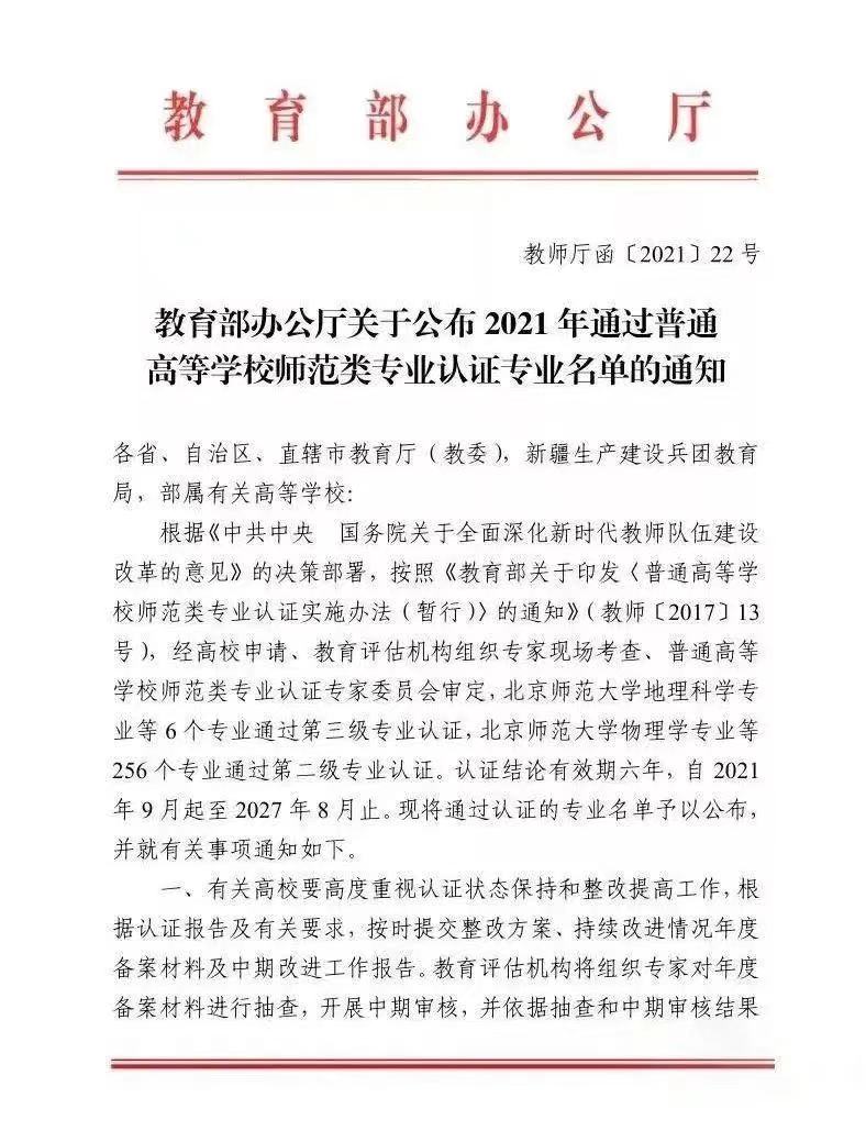 日前,教育部公布2021年通过普通高等学校师范类专业认证名单,该认证由高校申请、教育评估机构组织专家现场考查、普通高等学校师范类专业认证专家委员会审定完成。