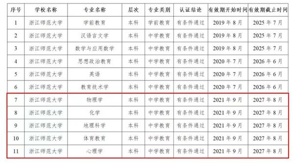 本次公布的专业名单中,全国6个师范类专业通过第三级认证,256个师范类专业通过第二级认证。其中浙师大物理学、化学、地理科学、体育教育、心理学5个专业通过二级认证,认证结论有效期六年,自2021年9月起,到2027年8月止。
