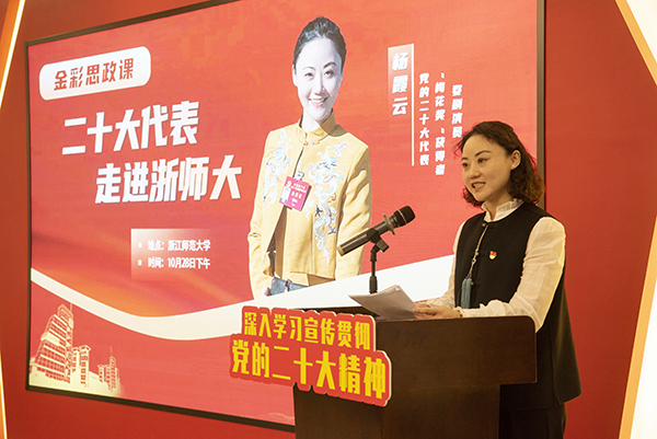 10月28日下午,党的二十大代表、浙江婺剧艺术研究院(浙江婺剧团)一级演员、中国戏剧“梅花奖”获得者杨霞云受邀来浙师大宣讲党的二十大精神,畅谈如何传承中华文化,坚定文化自信。浙江师范大学思政课教师代表、新时代“80、90、00”宣讲团成员分别做主题宣讲,文艺式、互动式、情景式的宣讲形式轮番呈现。