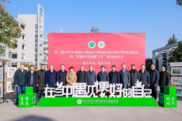 12月29日上午,浙江师范大学附属富阳实验学校举行第二轮合作共建签约仪式暨“智能时代的教与学”教育研讨会。中国教育学会常务副会长、《中国基础教育》总编辑翟博,中国教育学会副会长、浙江省教育学会会长、浙江省教育厅原副厅长韩平,浙江师范大学副校长、教育学院院长林一钢,杭州市教育局副局长蒋锋,富阳区副区长詹艳青等出席会议。