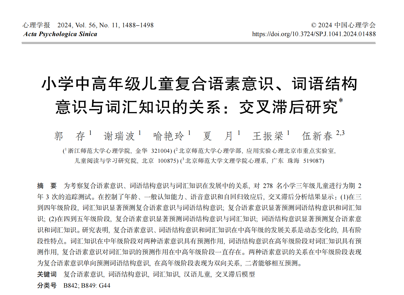 近日,浙江师范大学心理学院谢瑞波教授课题组在国内权威a类期刊《心理学报》上发表题为《小学中高年级儿童复合语素意识、词语结构意识与词汇知识的关系:交叉滞后研究》的学术论文,心理学院2022级硕士研究生郭存为论文第一作者,谢瑞波教授为论文的通讯作者。